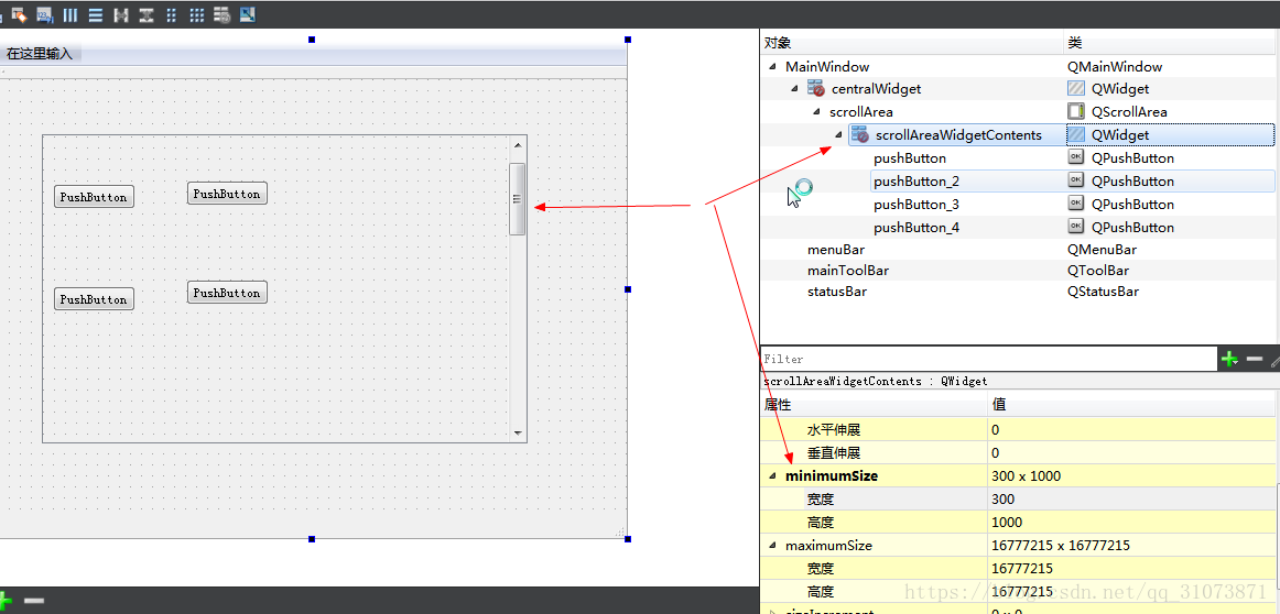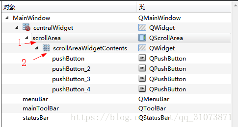 Pode-se descobrir que os quatro botões não estão localizados diretamente em qscrollarea, mas em seu membro scollareawidgetcontents. O tipo deste membro também é o tipo de controle QWidget, ou seja, o próprio container do qscrollarea possui duas camadas. Os botões e outros controles que colocamos estão todos localizados na camada scrllareawidgetcontents. A seguir, chamo qscrollarea.widget “contêiner interno” ou “camada de conteúdo”. O contêiner interno é um controle filho de qscrollarea.