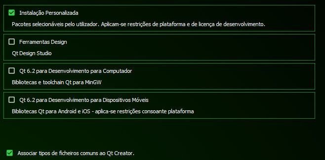 Na seção Installation Folder, selecione Instalação Personalizada. Recomendamos não alterar o diretório em que o Qt será instalado.