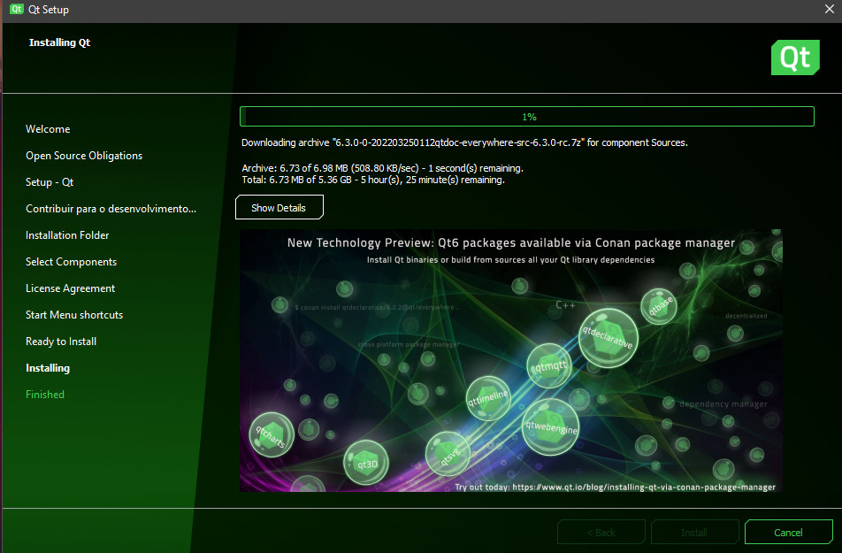 Depois concorde com os termos de uso e na seção Start Menu shortcuts deixe selecionado Qt. Em seguida, na seção Ready to Install informará que está pronto para começar a instalar o Qt e mostrará o quanto de memória utilizará (se estiver muito pesado, volte até a escolha de versão na seção Select Components e desmarque os componenentes que não terão uso para você), se estiver tudo certo clique em Install e a instalação irá iniciar. Esta é a tela de instalação: